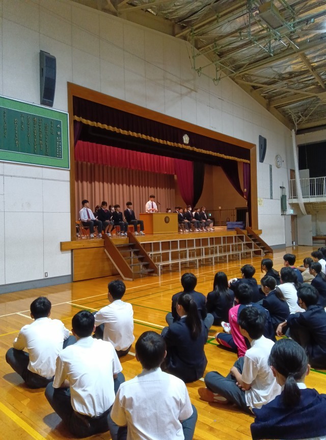 今朝の生徒朝会では生徒会役員の新旧交代と委嘱状の交付が行われました。これまで玉川...