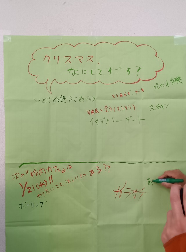 本校では、定期的に等々力児童館のみなさんや地域のボランティアの方々による「校内カフェ」を開催しています。放課後の生徒たちの居場所として、盛り上がっています。今日は今年最後のカフェ。クリスマス気分の楽しい会でした。
