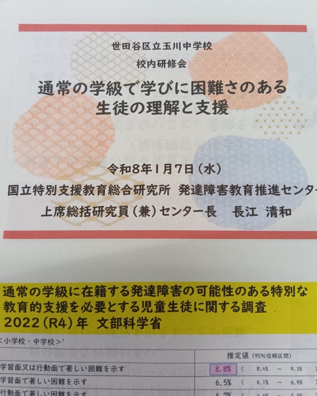 冬季休業最終日の7日は、教職員は会議と研修の日でした。今回の校内研修会も、国立特別支援教育総合研究所発達障害教育推進センター上席研究員兼センター長の長江清和先生を講師にお招きし、ケーススタディに基づいた協議を行った後、指導講評をいただきました。