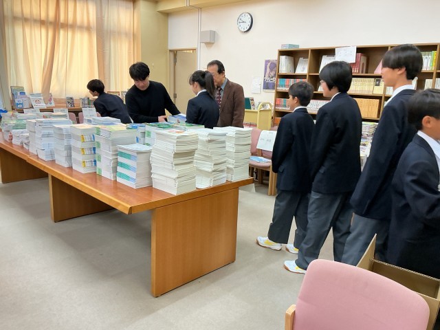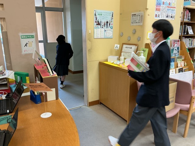 緊張の1日目。朝から読書活動にしっかり取り組めました。教科書配布では図書室から4階の教室まで、道に迷いそうになりながら運んでくれました。