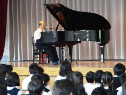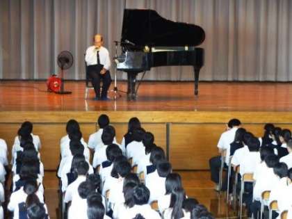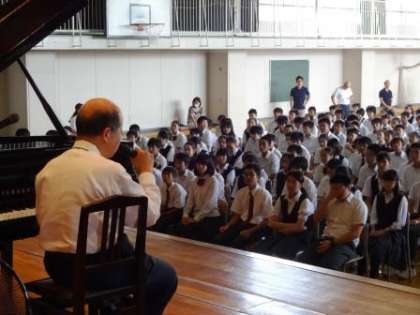 道徳地区公開講座では、毎年講師の方をお招きして講演会を行っていますが、今年は目の不自由なピアニストの島筒英夫氏に講演をお願いしました。目が見えないという逆境に負けずに素晴らしいピアノの弾き語りとトークを与えてくれる姿に感動した生徒も多かったと思います。1時間という長い時間を楽譜や原稿を見ずに(あたりまえですが)演奏・講演し、しかも時間がぴったりというところにプロ意識を感じた生徒もいました。