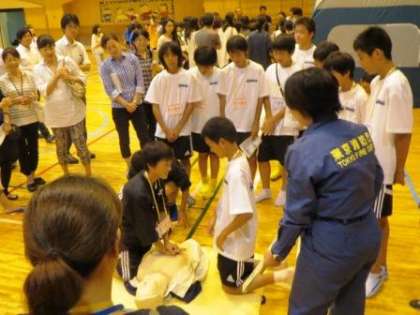 防災の日の今日、地域の避難所訓練が行われました。地域の方、本校と中町小の教職員、本校のサッカー部の生徒が合同で参加しました。災害時の一次避難所となる体育館の一人当たりのスペースを体験したり、AEDや心臓マッサージの訓練を受けたりしました。緊急時には中学生も地域の役に立つことができるという「協働・共助」の精神を学ぶことができました。