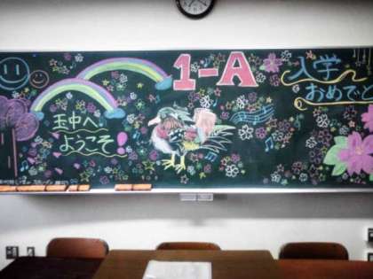 新入生を迎えるために、各クラスの黒板に美術部がイラストを描きました。どのクラスの絵も新入生を温かく迎えるものでした。