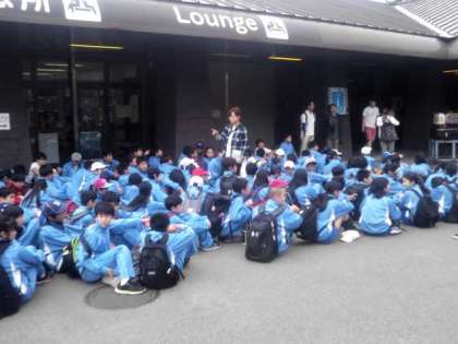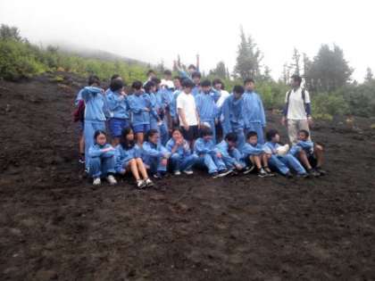 1年生ははじめの見学地、富士山五合目に到着し、クラス写真を撮りました。富士山の山頂は雲に包まれていましたが、笑顔は晴れ晴れとしていました。