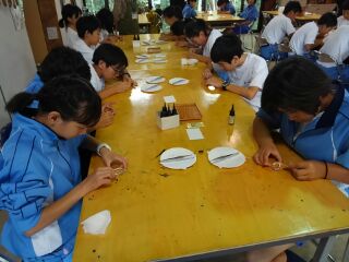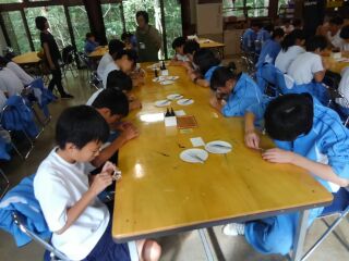 溶岩樹型のガイドウォークに並行して、他のクラスは押し花のペーパーウエイト作りを体験しました。