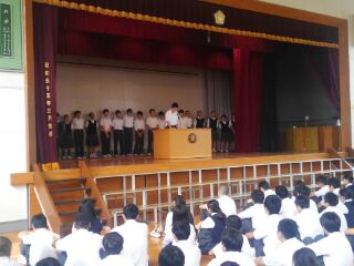 30日(月)の朝礼では、2日に行われる世田谷区陸上競技大会に参加選手の壮行会をもちました。代表生徒が意気込みを述べ、全校生徒が拍手で激励しました。