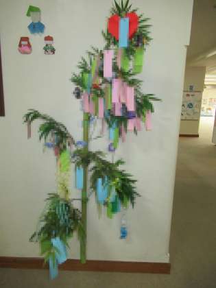 3年生の階には、七夕飾りがあります。付けられた短冊には、3年生の「受験」「テスト」「夢」などが書かれてあります。