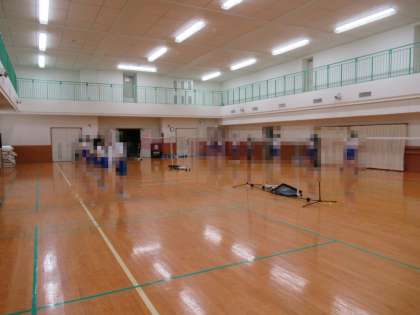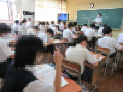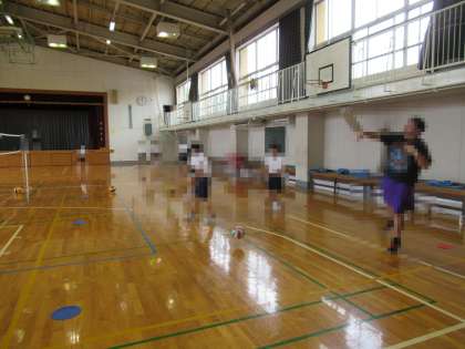 大型TVでの「始業式」後は、早速、授業開始です!ALTの先生も男子保健体育授業に参加してサーブを打っています。
