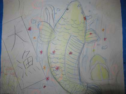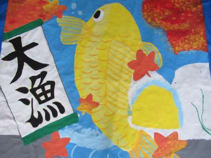 下絵(左写真)から、大漁旗(右写真)が出来上がりました。イメージとアイデアをつなげて、作品になる過程は素晴らしいですね!