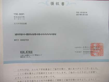 ¥34474円の領収書とともに、感謝状がありました。感謝状には「世界150以上の国と地域でユニセフの活動に使われる」とありました。