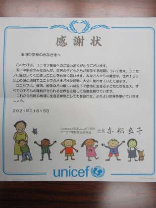 生徒会活動「ユニセフ募金」感謝状届く(校長より)