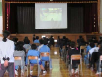 昨日の2年生に続き、1年生の「交流会」です。歌の披露や動画を鑑賞しました。その後、SDGsに基づき、講師の先生をお招きして「国際理解教育」の授業を受けました。