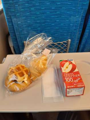 軽食が配られました。只今、名古屋でのぞみ号の通過待ちです。ここまで予定通りです。