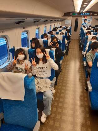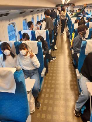 新幹線車内の様子です。残念ながら外は曇天で富士山は見られませんでしたが、皆元気に過ごしています。