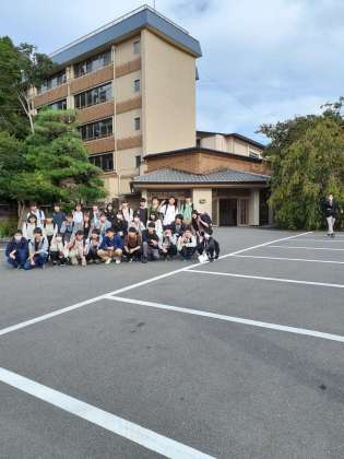 お宿の前で、クラス写真を撮りました。女子は撮影前に前髪を整え、笑顔で撮影に臨みます。