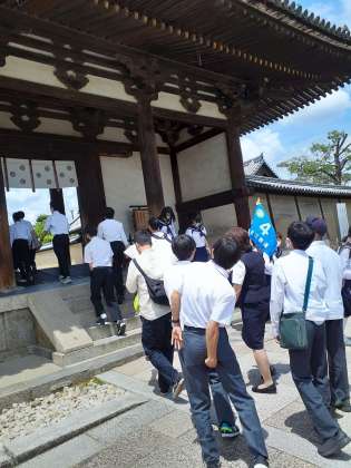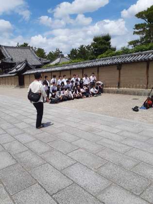 法隆寺に着きました。時間帯が重なったせいか、大勢の人がいます。記念写真を撮ました