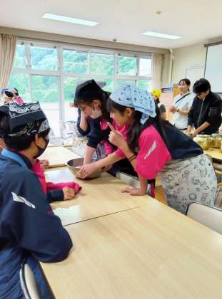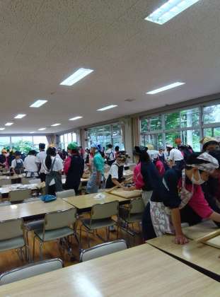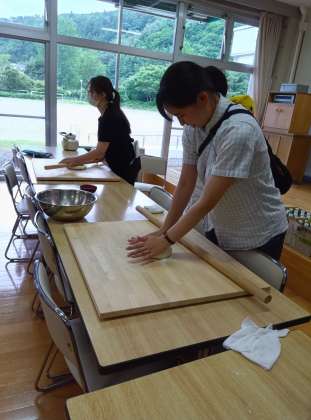 開校式の後、部屋に荷物を置いたら、一息つく間もなく、すぐに食堂に集合しました。夕食のための「うどん作り」のためです。小麦粉を捏ねての生地づくりは、簡単なようで、実はとても力の要る作業です。生徒が仲間と相談しながら、交代で生地作りに奮闘する傍ら、教員も馴れない作業を頑張りました。