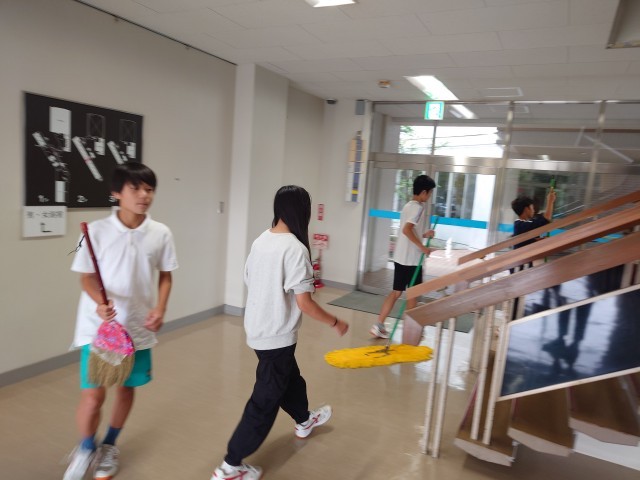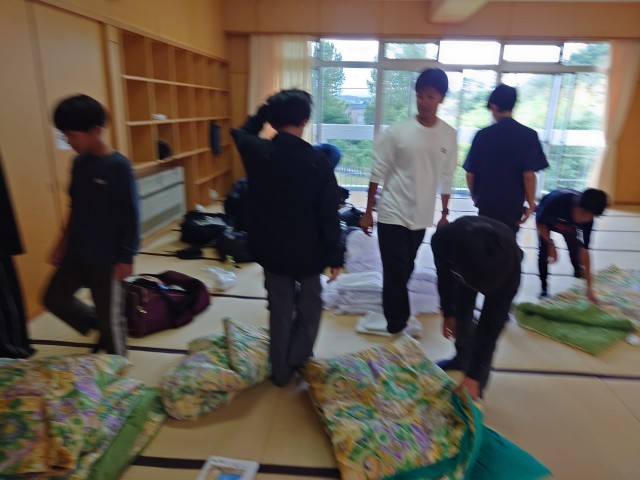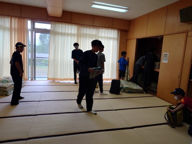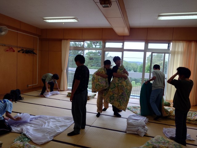 来た時より綺麗にをモットーに、全力で取り組みます。部屋の片付け、お布団の整理整頓、お部屋や活動場所の清掃、みんなで協力して行いました。
