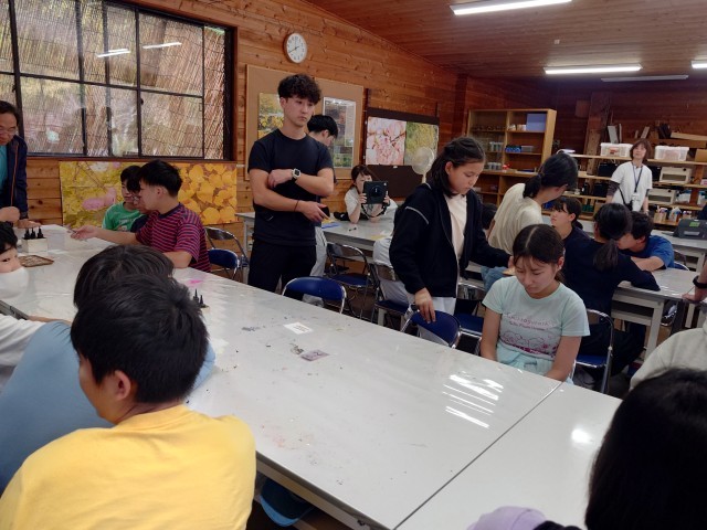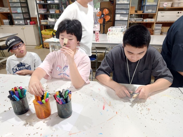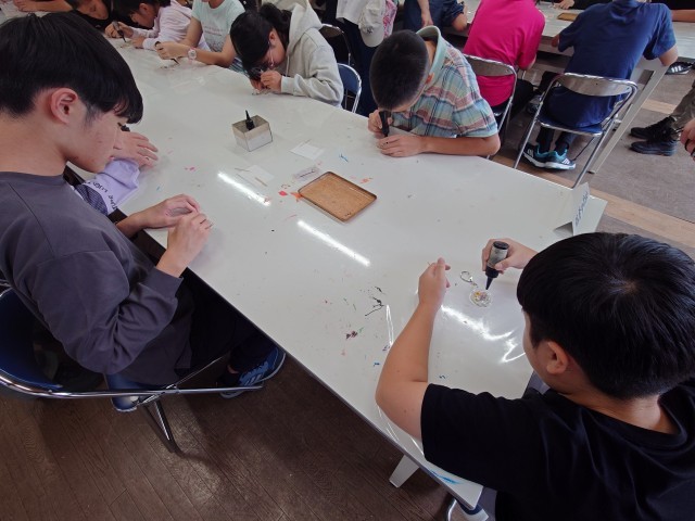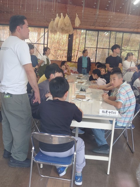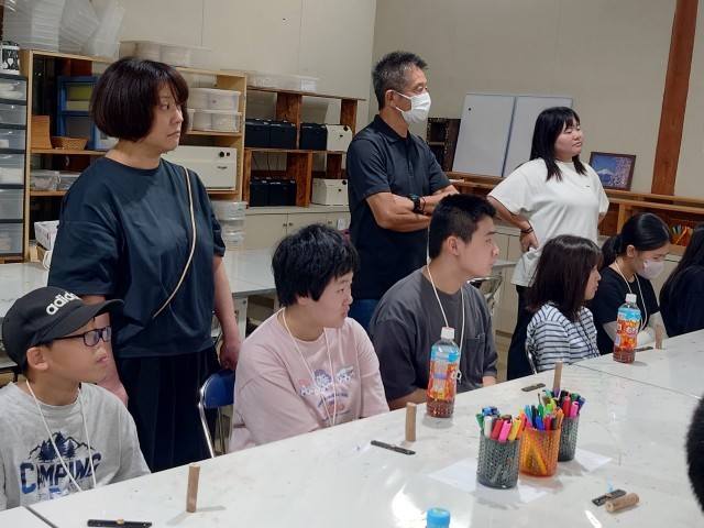 バードコールチームも、説明を聞いて、さあ作業開始。カッターで、木を削っていきます。