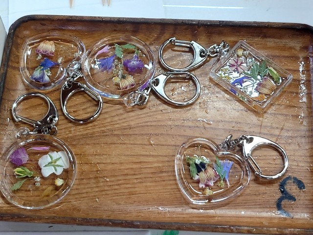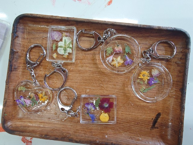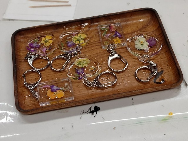キーホルダーチームは、お花を並べて、特殊な樹脂を入れて仕上げます。慎重かつ繊細に!!