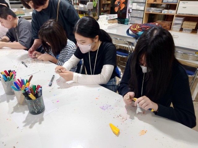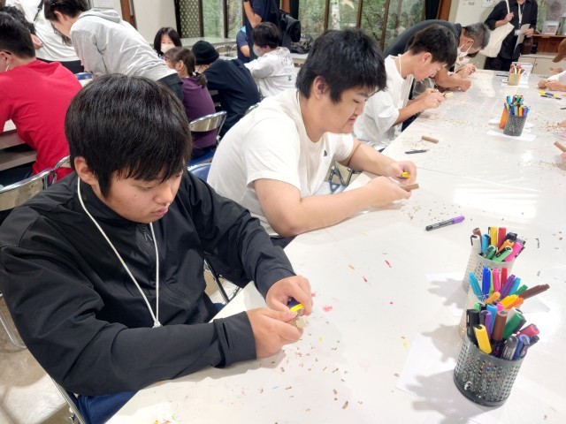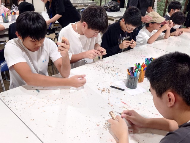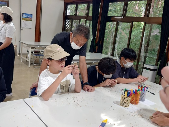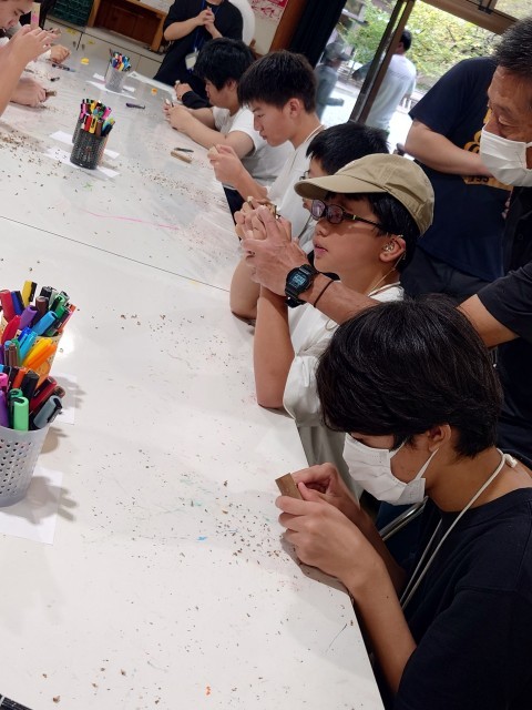 怪我をしないように、集中して気を削っていきます。削ったところにイラストを描いていきます。世界にたった一つだけの自分のバードコール。