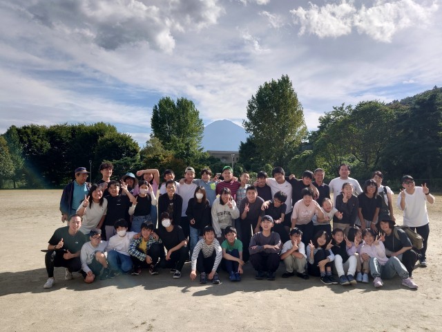 開園式が終わって、園庭で富士山をバックに写真を撮りました。