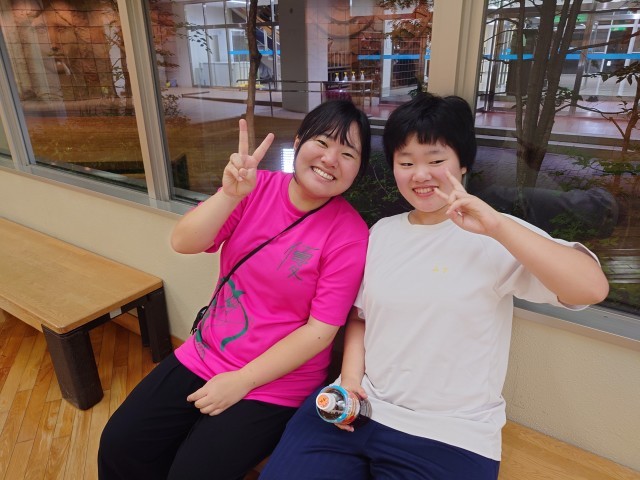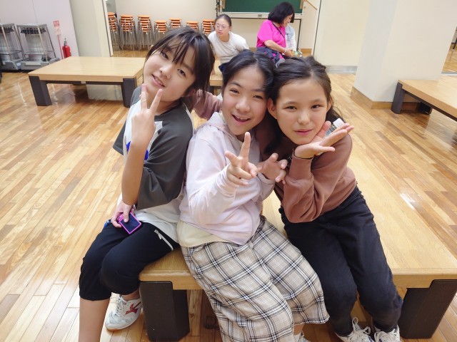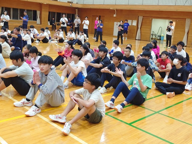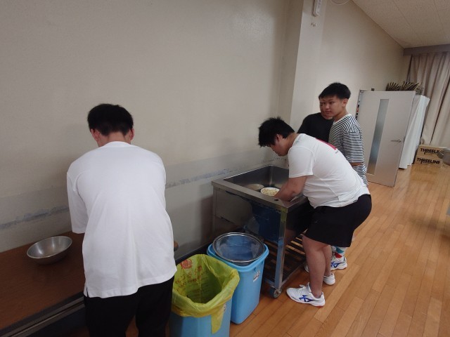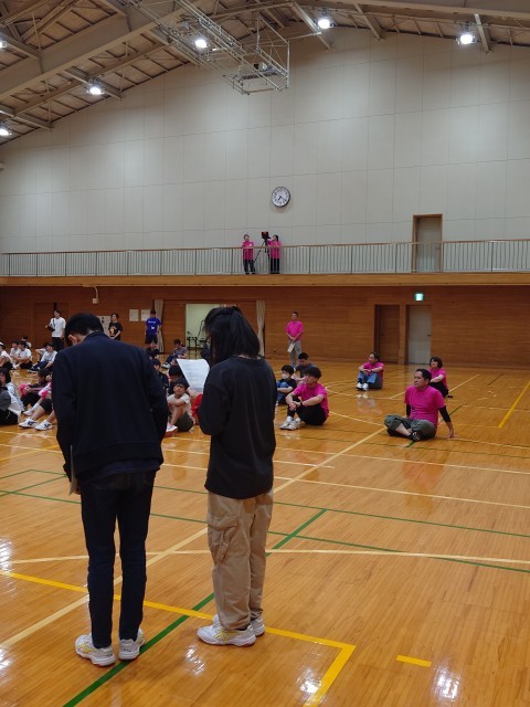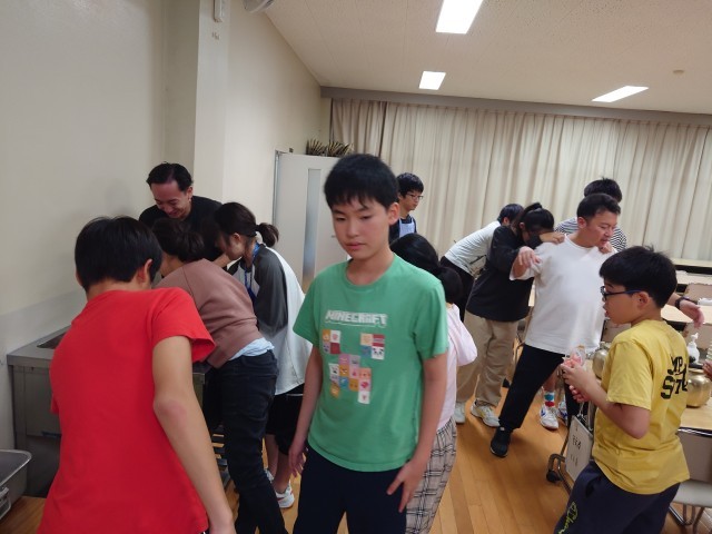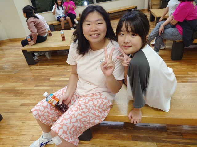食事の片付けを協力して行いました。7時からのレクリエーションに備えて、早めに体育館へ。お友達や先生との楽しい一時です。