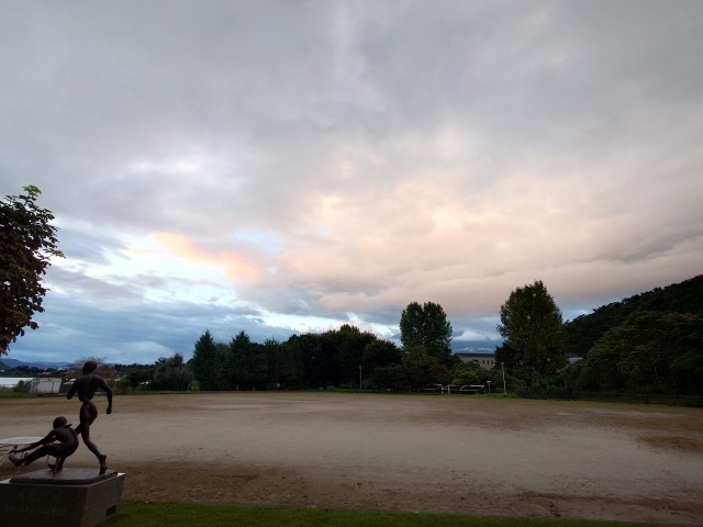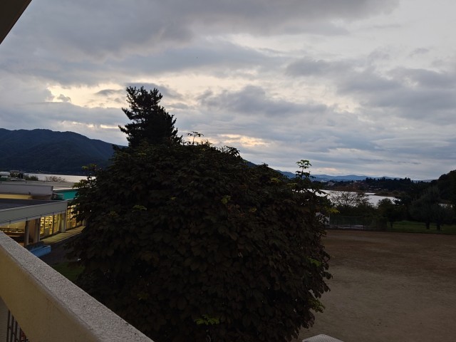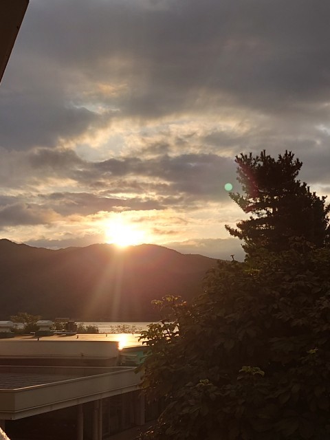 河口湖は曇り。気温17℃の朝を迎えました。富士山も少しだけ雲から裾野をのぞかせています。