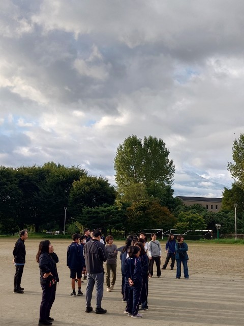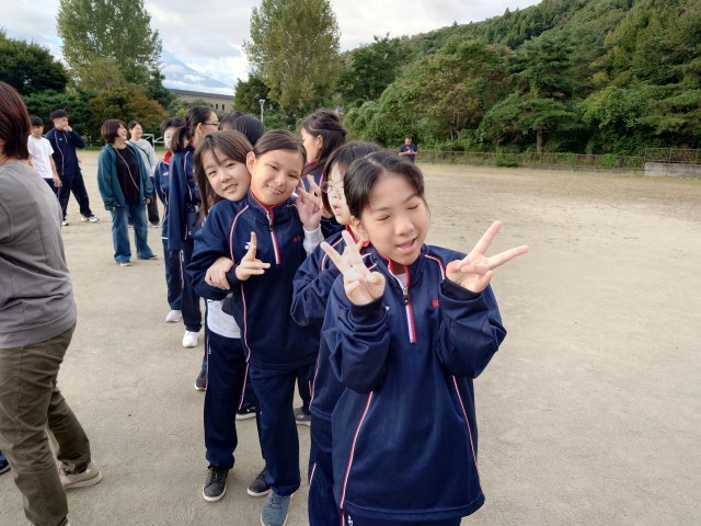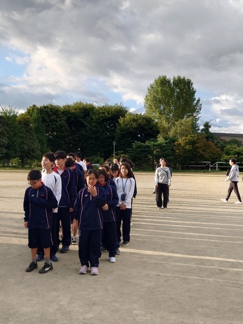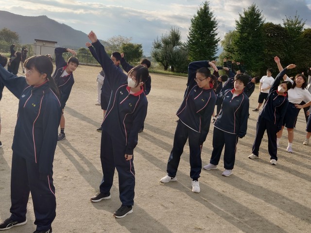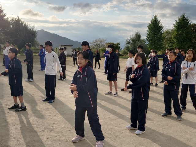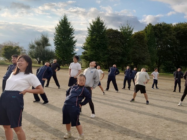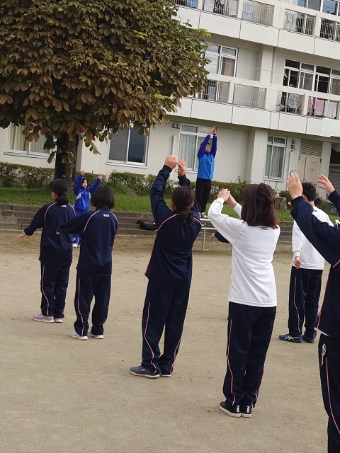園庭で朝礼です。 ドラえもんの掛け声のラジオ体操に合わせて?しっかりと手足を伸ばしました。