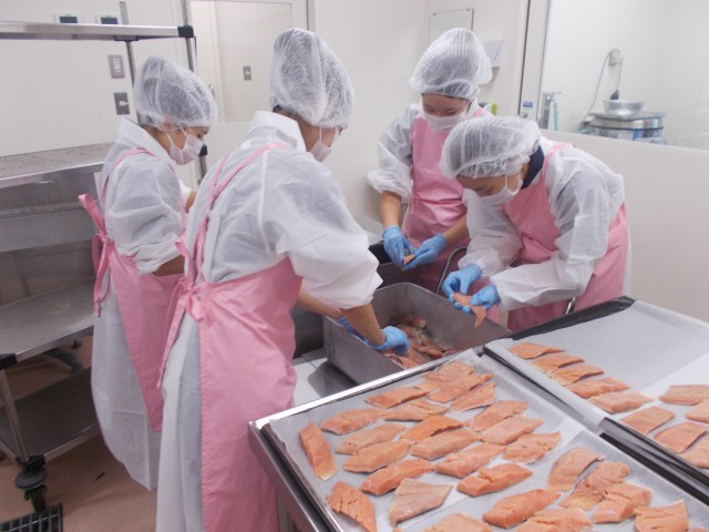 職場体験の生徒が、鮭の西京焼きの鮭を焼くための下準備をしています。