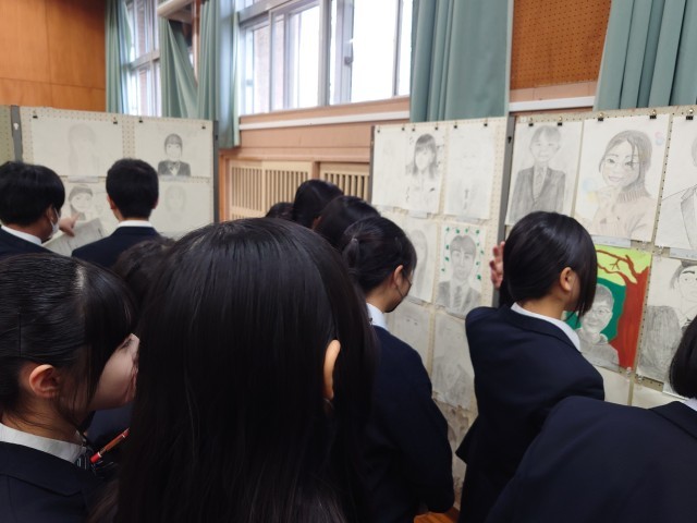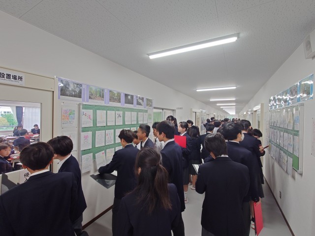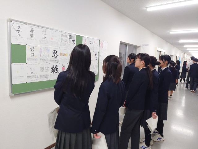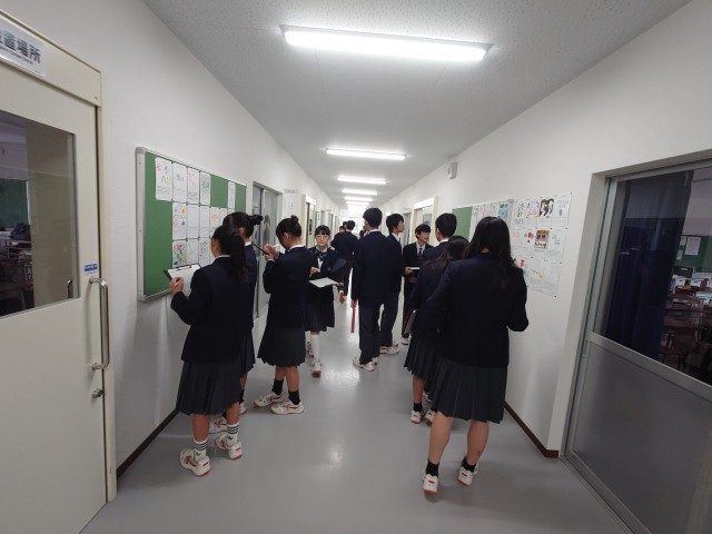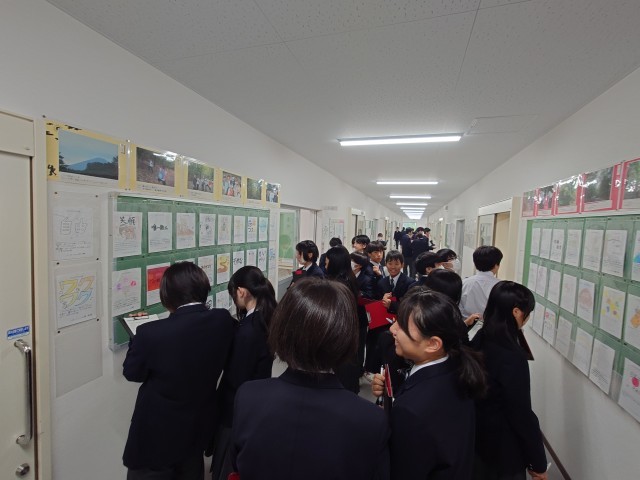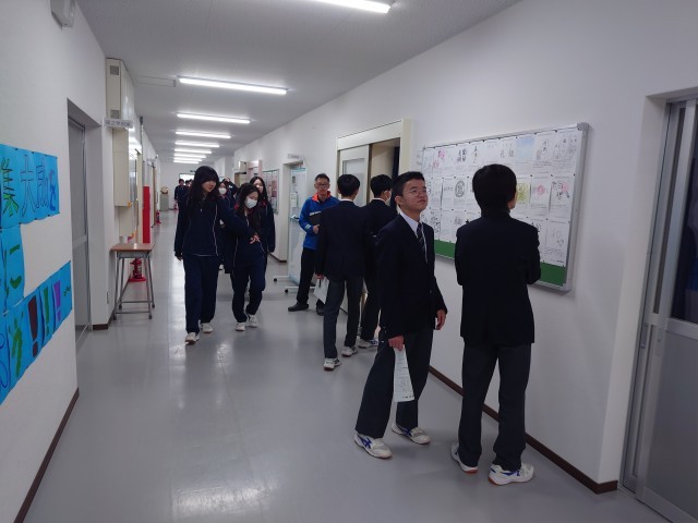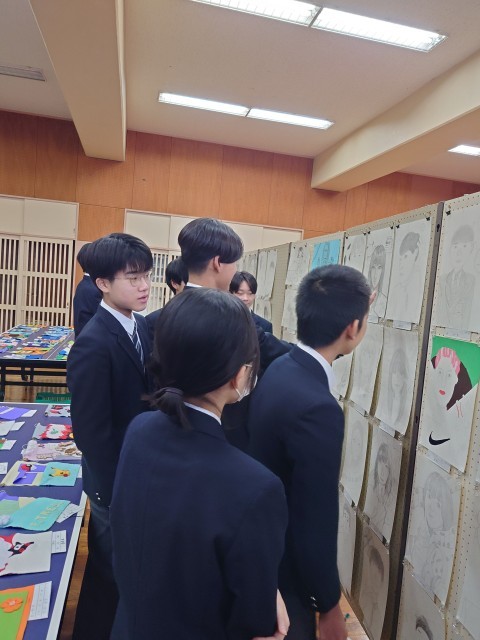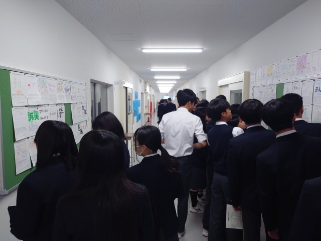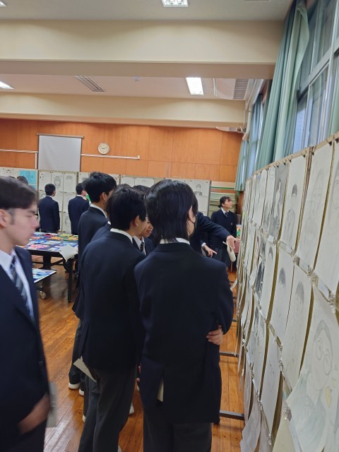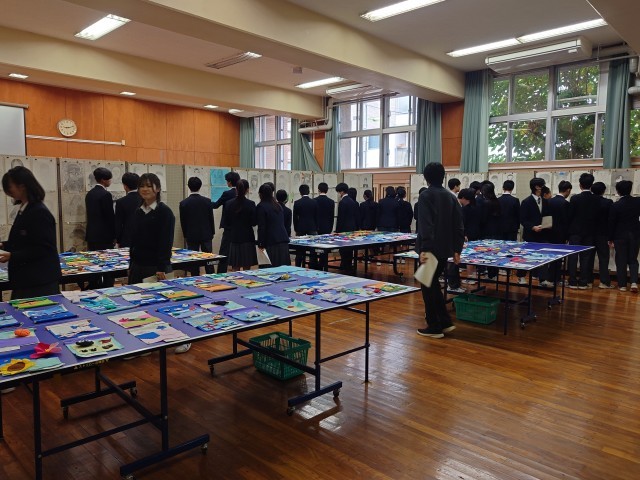 3年生が、見学中。日本語ポスター、格技室には、3年生とI組の作品が展示されています。