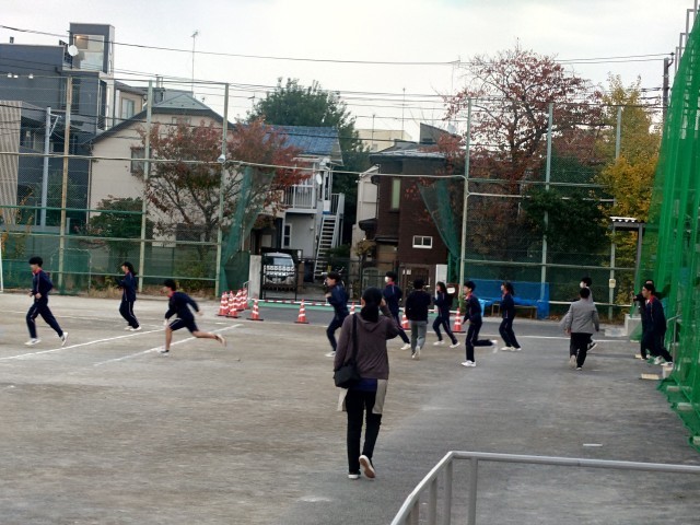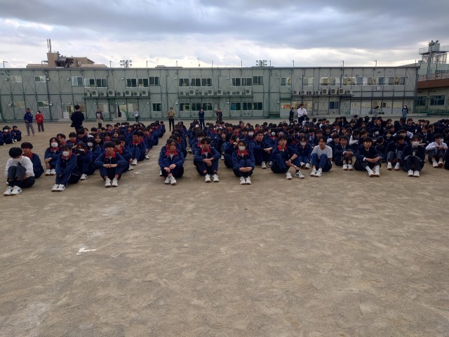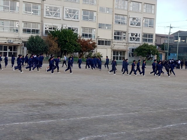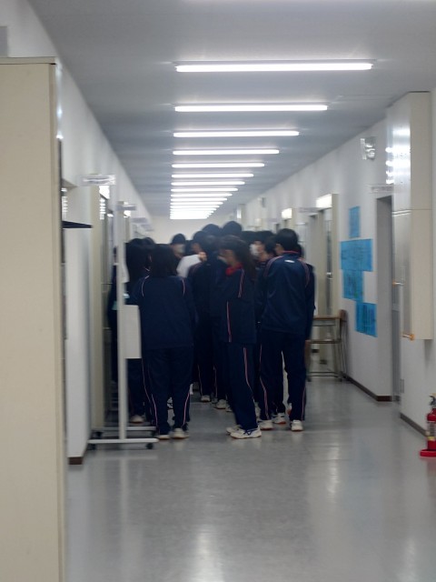 仮設校舎になって、2回目の実地訓練です。主事室を火元にして、昇降口が使えない想定での避難。