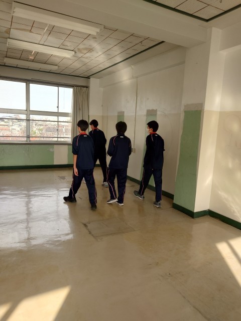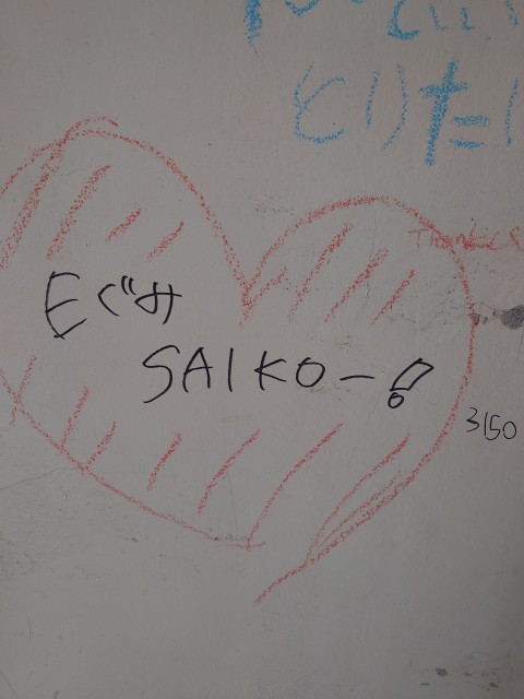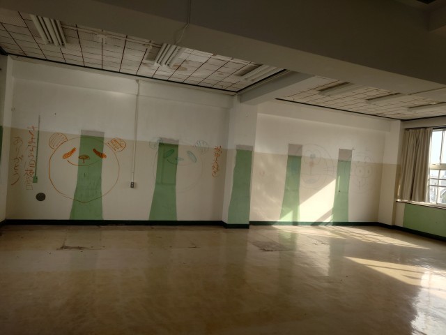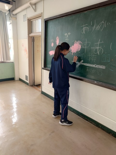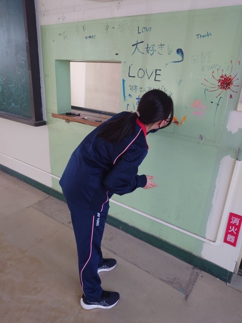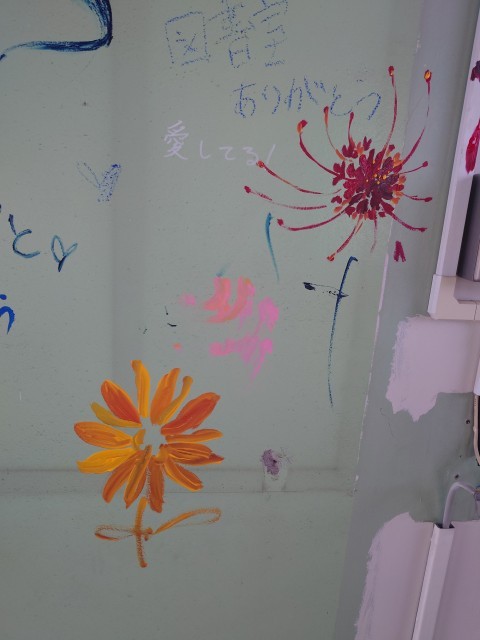 2日目もたくさんの絵や感謝の言葉を描いていました。元図書室に描かれていた大きな丸にパンダをつけくわえました。