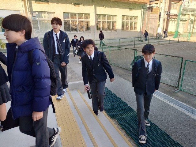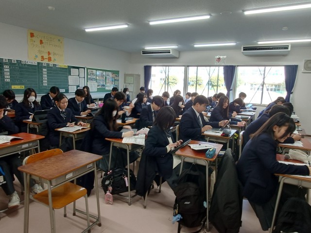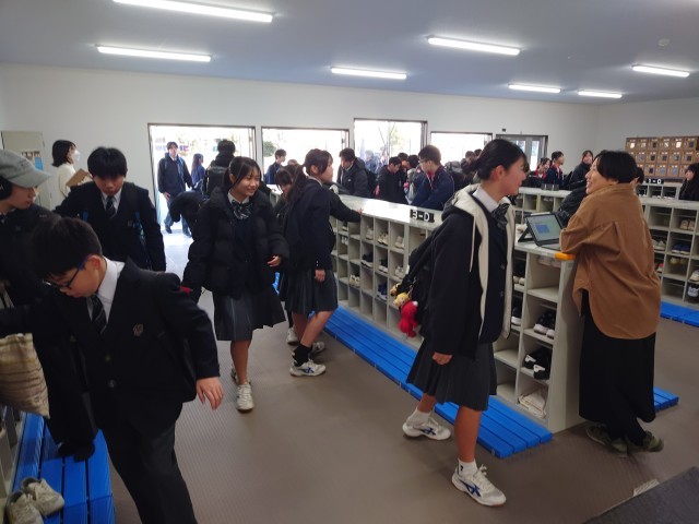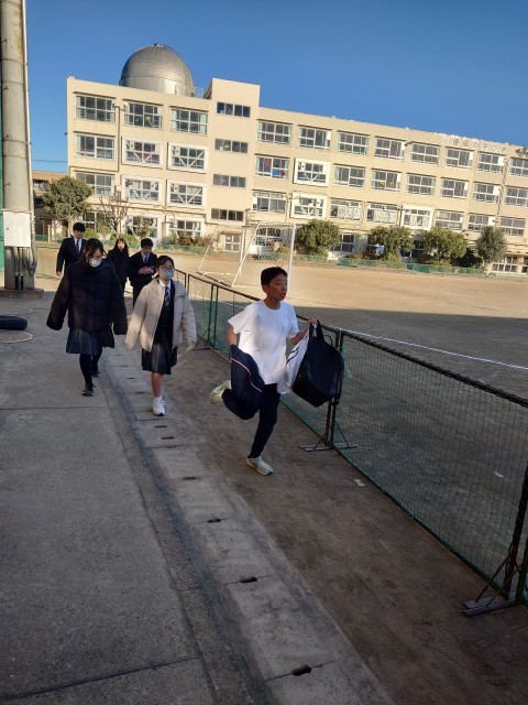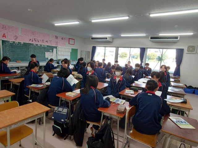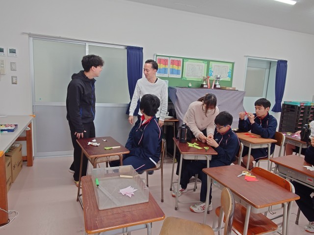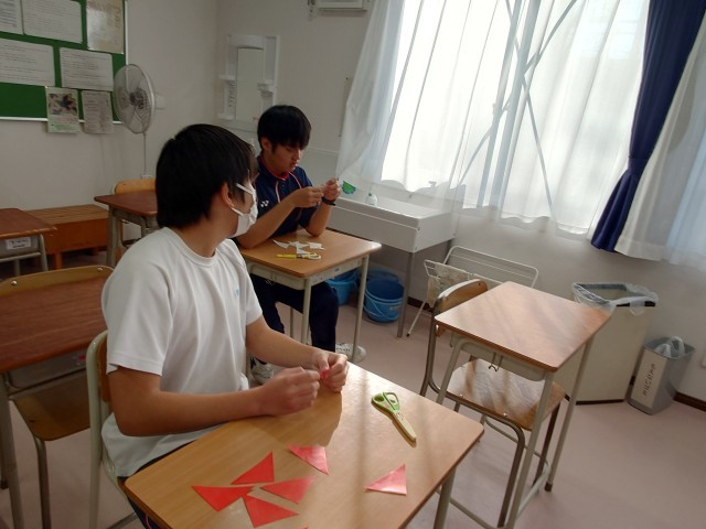 毎月10日は、あいさつ、声かけの日です。生活委員のあいさつ運動から始まります。I組は、折り紙教室です。何を作るのでしょうか?