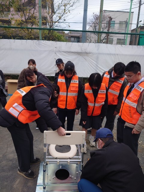 仮校舎の後ろにマンホールトイレがあり、設置しました。