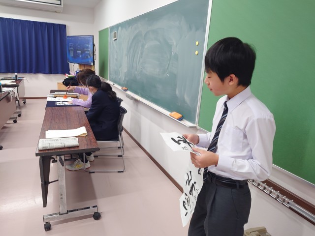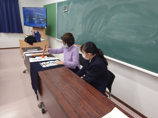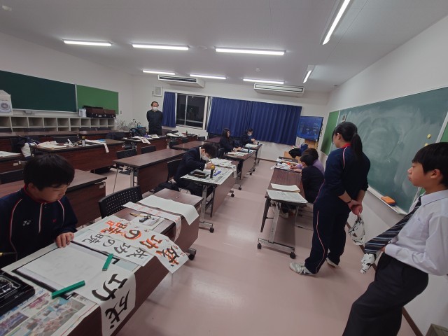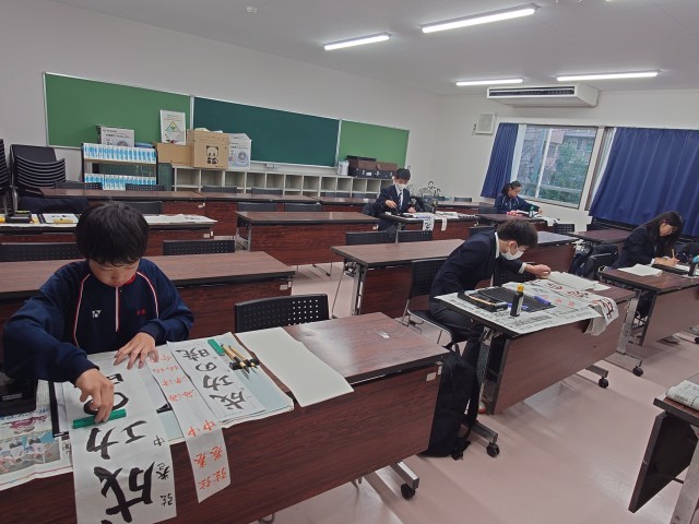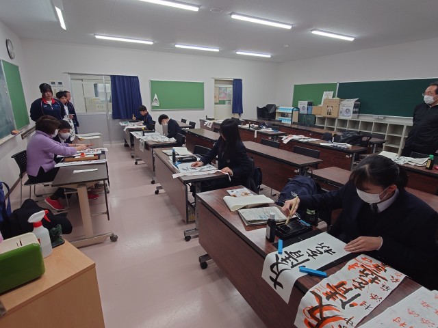元学校運営委員委員長の苗代さんを講師にお願いしています。8名の参加生徒が、今年の書き初めの練習をしました。宿題を終えた人もいるようです。