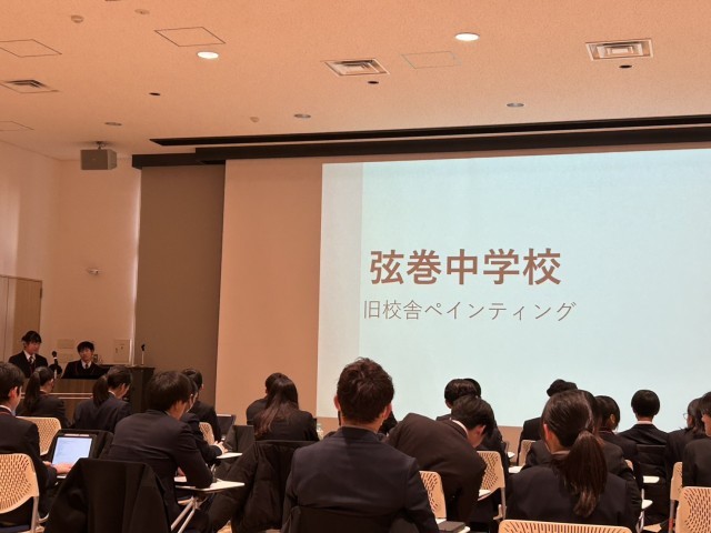 サミットのメンバー60名と最後の発表です。魅力ある学校を創るため、弦巻中では、縦割り班で活動した校舎ペインティングを取り上げました。