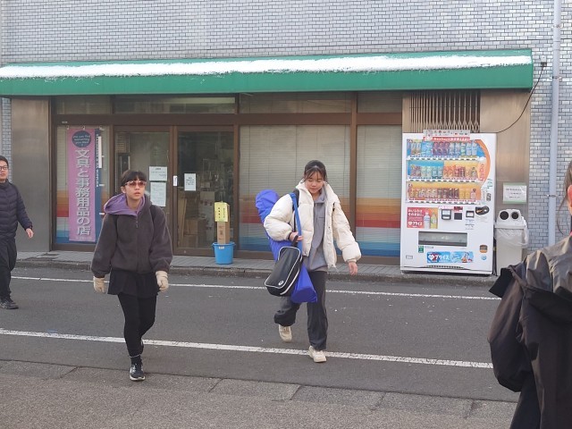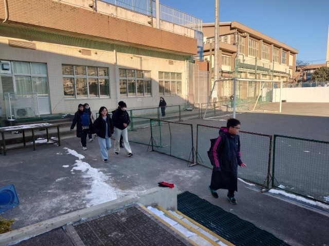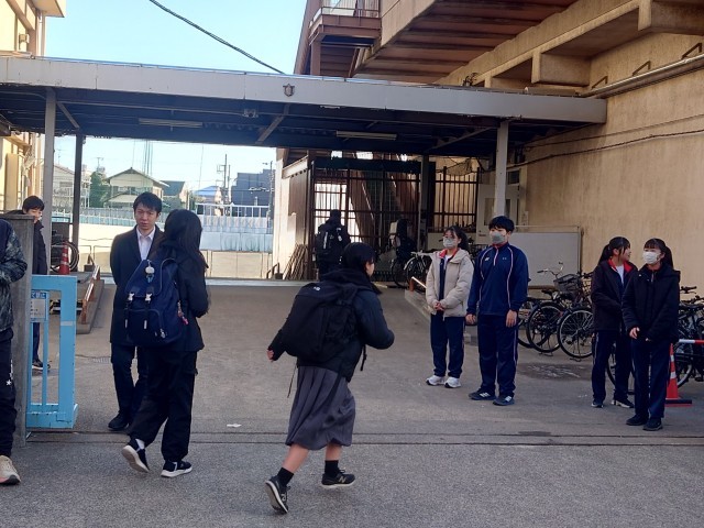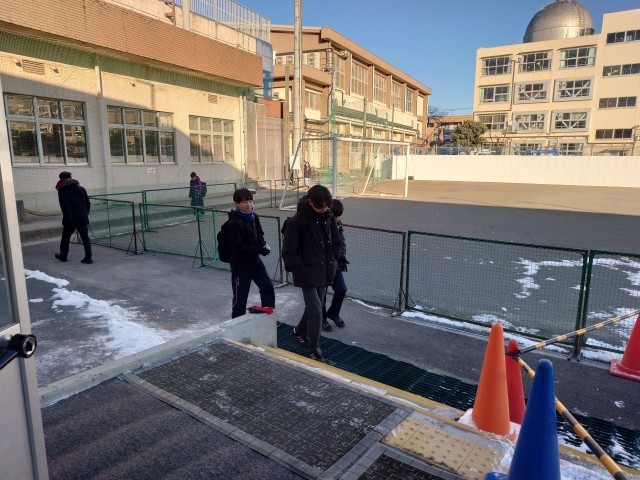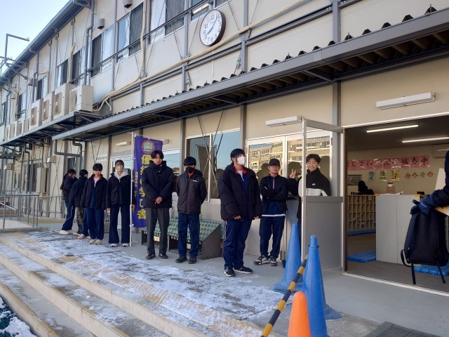 昨日の雪が残る中、生活委員によるあいさつ運動です。