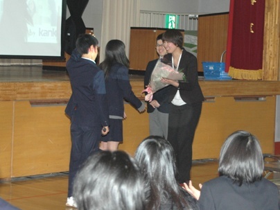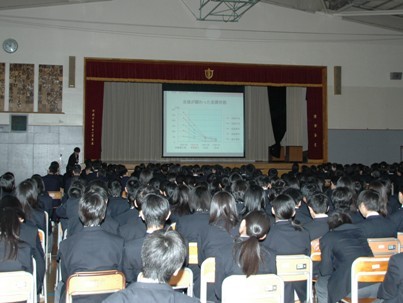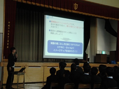 4月13日(土)、本校体育館においてマナー講演会が行われました。本校の新標準服をデザインした会社の方が講師をしてくださり、「標準服の役割・機能・着こなし」などについてお話していただきました。