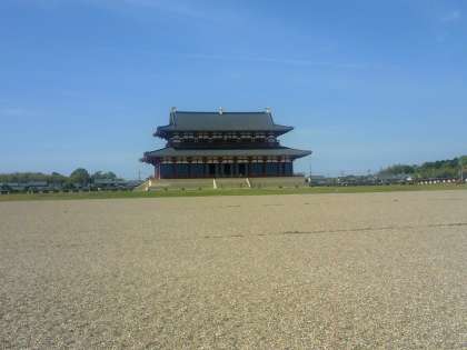 平城宮跡の第一次大極殿を朱雀門から見る。