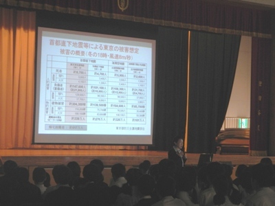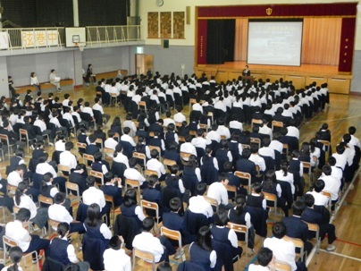 5月21日(火)6校時、本校体育館において「防災講話」が行われました。講師は元弦和会会長のソルステインソンさんで、「東日本大震災での体験と教訓」について、ご自身の体験を交えてお話しくださいました。避難所の写真や豊富なデータを、生徒たちは真剣に見つめていました。また、防災講話の後に体育館からの避難訓練を行いました。