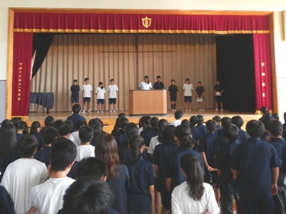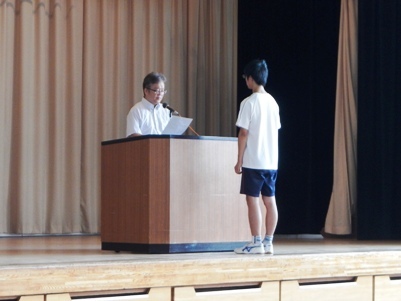 7月10日(水)、第4回生徒会朝会がありました。生徒会役員や各専門委員会から「夏休みに向けて、1学期を振り返り、2学期につなげよう!」「地域清掃への参加」などの呼びかけや活動報告がありました。期末考査もおわり、もうすぐ夏休みです。1学期の締めくくりをしっかりと行い、気持ちよく夏休みを迎えてほしいと思います。また、卓球部の表彰がありました。おめでとうございます。