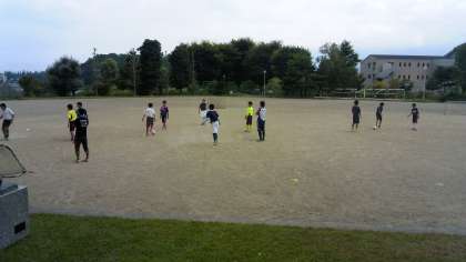 園庭で活動するサッカー部。パス練習を一生懸命行っています。