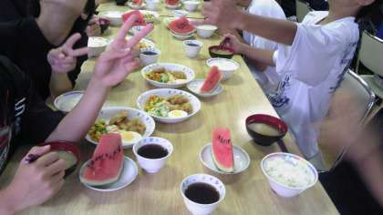 練習の後の食事はとてもおいしいですね!みんなもりもりたべています。