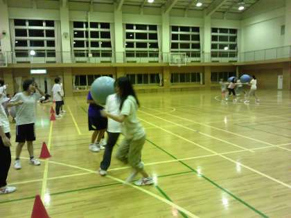 レクが始まりました。レク係が一生懸命考えました。最初はボール運びです。