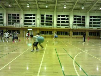 ボール運び第3弾、2人の背中でボールを挟んで運びます。