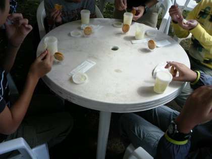 作ったバターをクラッカーにつけて、おいしそうに食べています。