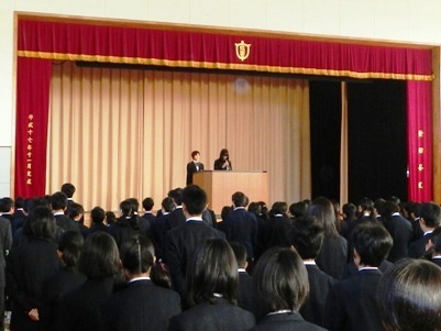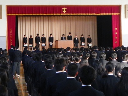 11月27日(水)、生徒会朝会において各専門委員会から「授業規律キャンペーン」「定期考査後の生活態度の改善」「手洗い・うがい」の呼びかけや、「今月の反省」と「来月の取り組み・目標」などについて報告がありました。