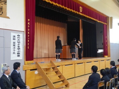 12月14日(土)、体育館にてセーフティ教室が行われました。講師に鷲尾洋子さんをお招きし、命の大切さを学ぶ講演を行っていただきました。実体験にもとづくお話に、生徒たちはみんな真剣に聞き入っていました。