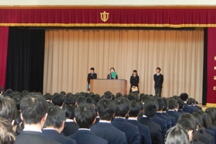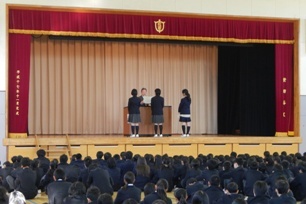 12月25日(水)、体育館において終業式が行われました。各学年の学級委員長からは、2学期を振り返り、成果と反省や3学期に向けての抱負について話がありました。思い出に残る充実した冬休みを過ごしてほしいと思います。また、「税の作文」の表彰が行われました。